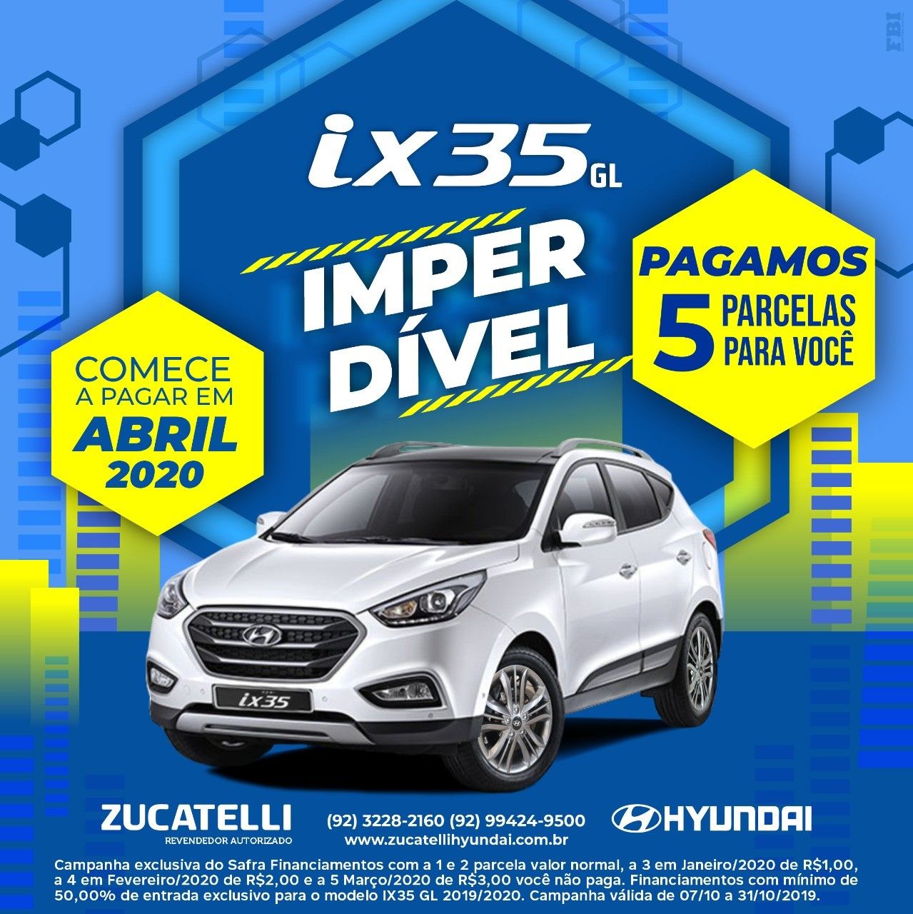 Campanha exclusiva do Safra Financiamentos com 1 e 2 parcela valor normal, a 3 em janeiro/2020 de R$ 1,00, a 4 em Fevereiro/2020 de R$ 2,00 e a 5 Março/2020 de R$ 3,00 você não paga. Financiamentos com mínimo de 50.00% de entrada exclusivo para o modelo IX 35 GL 2019/2020. Campanha válida de 07/10 a 31/10/2019.